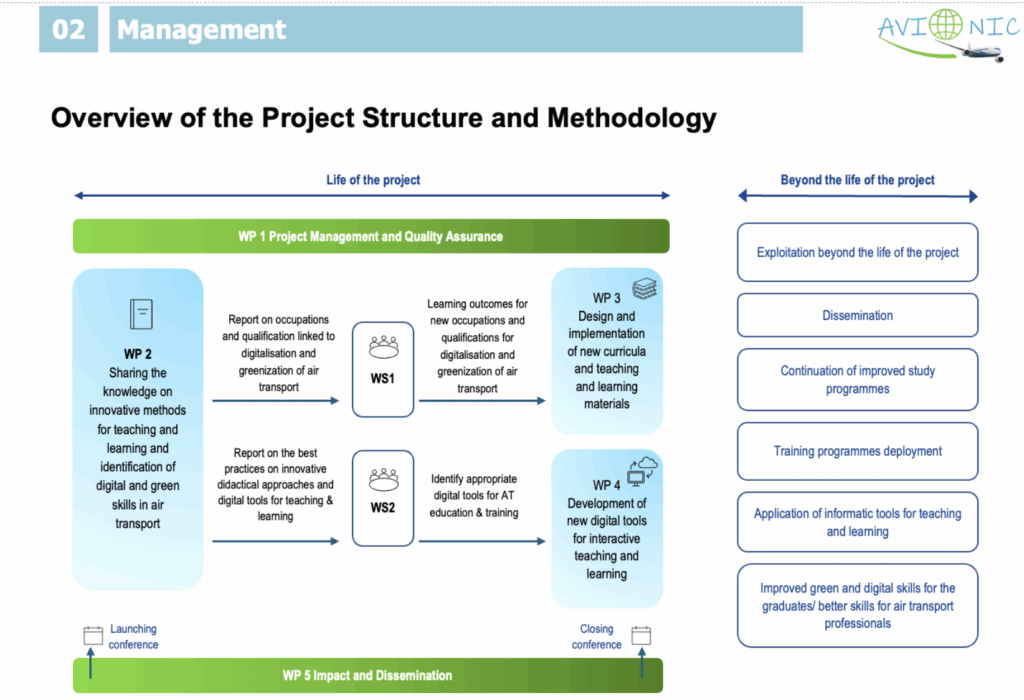 The AVIONIC project was structured around five interconnected Work Packages (WPs), each designed to advance innovation in teaching and learning for a greener and more digital aviation sector. Together, these WPs delivered concrete results that have strengthened higher education and industry collaboration.